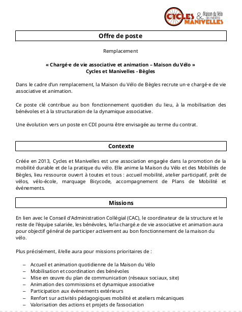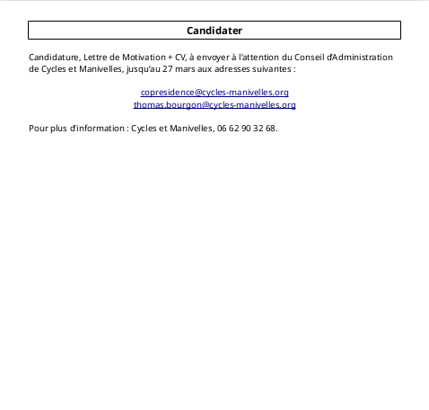 Candidatures (CV + lettre) à envoyer à l’attention du Conseil d’Administration de Cycles et Manivelles avant le 27 mars 2026