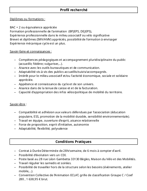 – Compatibilité et adhésion aux valeurs défendues par l’association (éducation populaire, ESS, promotion de la mobilité durable, sensibilité environnementale).