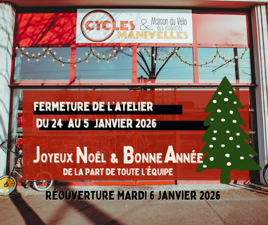 En raison du petit Papa Noël qui descendra du ciel avec des vélos par milliers dans sa hotte, l’atelier sera fermé du 24 décembre au 5 janvier, parce qu’il faudra bien tester nos nouveaux jouets