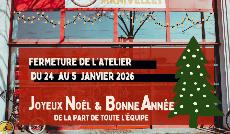 En raison du petit Papa Noël qui descendra du ciel avec des vélos par milliers dans sa hotte, l’atelier sera fermé du 24 décembre au 5 janvier, parce qu’il faudra bien tester nos nouveaux jouets