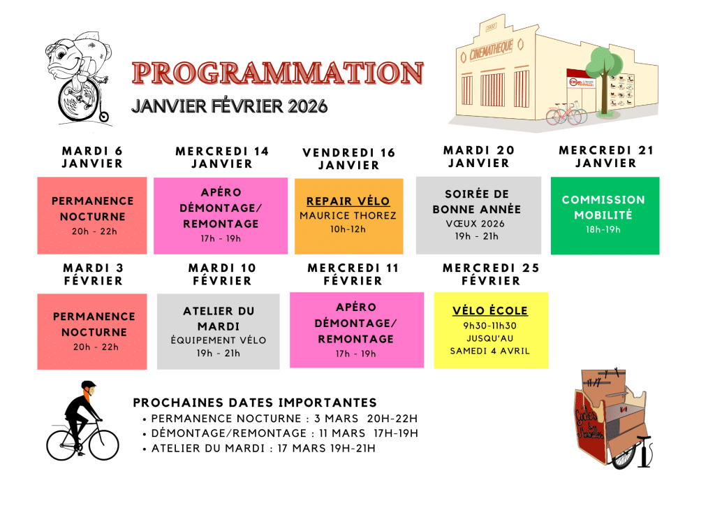 - les ateliers du mardi avec une nouvelle programmation, toujours plus d’échanges et de partages autour du vélo et des mobilités ! à découvrir ! — prochain rdv : mardi 10 février
