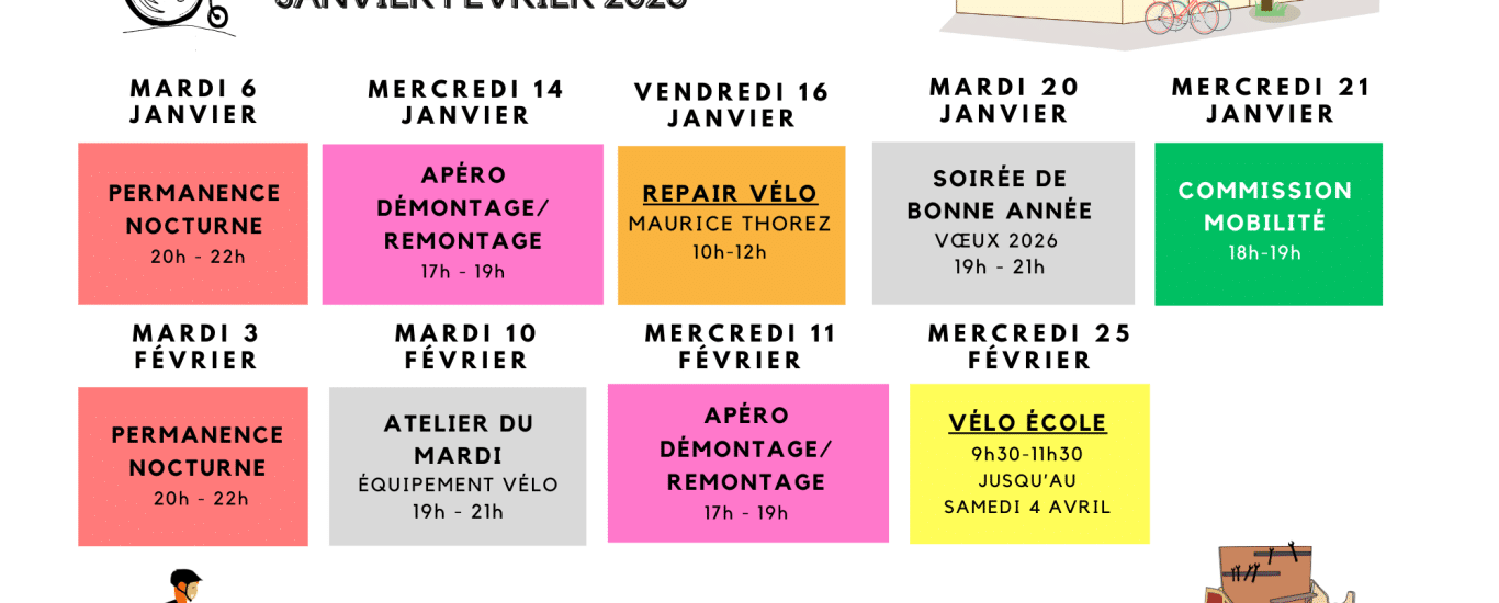 - le Repair vélo qui remplace la permanence mobilité à Maurice Thorez de 10h à 12h avec l’équipe du Centre social et culturel l’Estey — prochain rdv : vendredi 6 février