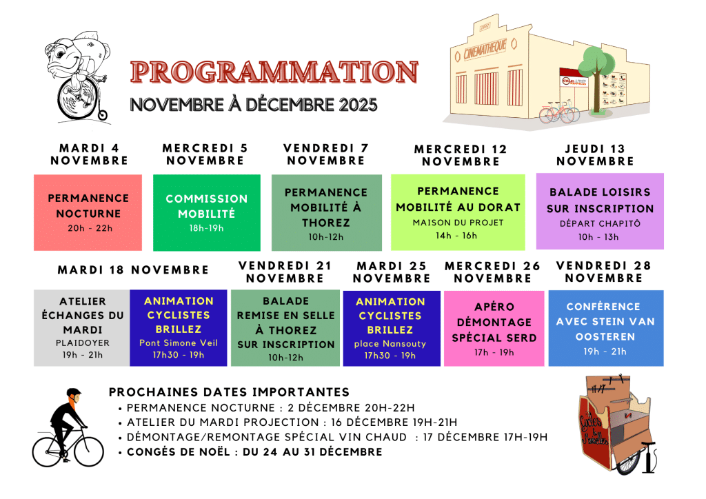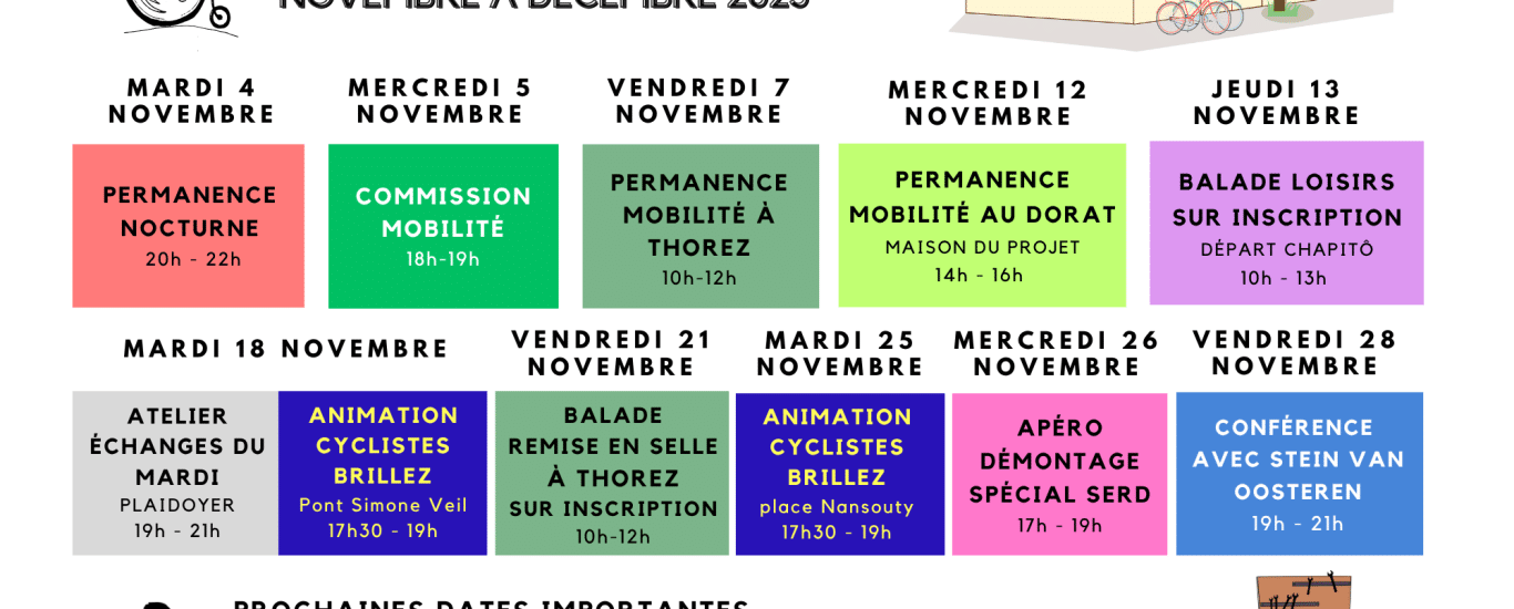 • Cyclistes Brillez : mardi 18 et 25 novembre de 17h30 à 19h
