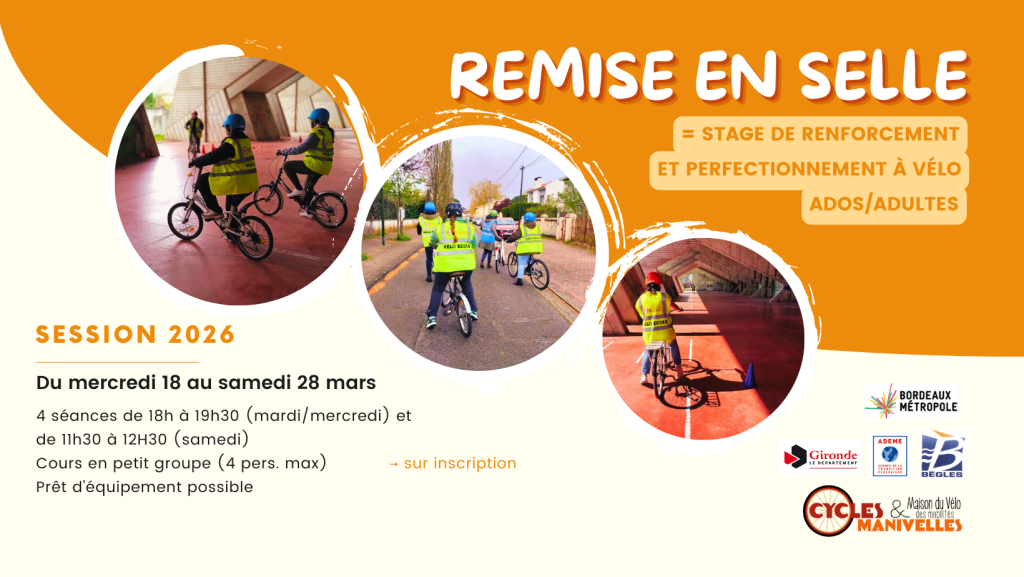 Stage de renforcement et perfectionnement 2026 pour les ados (à partir de 16 ans avec autorisation parentale) et les adultes sachant déjà pédaler mais ayant besoin de reprendre confiance ou confirmer leur niveau à vélo.
