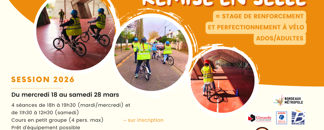 Stage de renforcement et perfectionnement 2026 pour les ados (à partir de 16 ans avec autorisation parentale) et les adultes sachant déjà pédaler mais ayant besoin de reprendre confiance ou confirmer leur niveau à vélo.