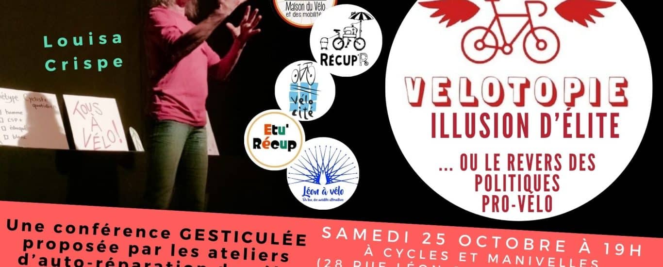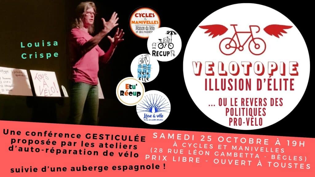 Le samedi 25 octobre, les ateliers d’auto-réparation de vélo de Bordeaux et alentours vous invitent à la conférence gesticulée de Louisa Crispe : « Vélotopie – illusion d’élite … ou le revers des politiques pro-vélo ». Rdv à 19h à l’atelier (28 rue Léon Gambetta, 33130 Bègles), entrée à prix libre.